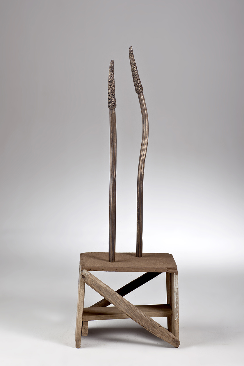 Image: Ancestor stool #2, Circa 1970’s – 2024, paternal grandparent wooden stool, paternal grandparents garden soil, bronze, 106x36x29cm
