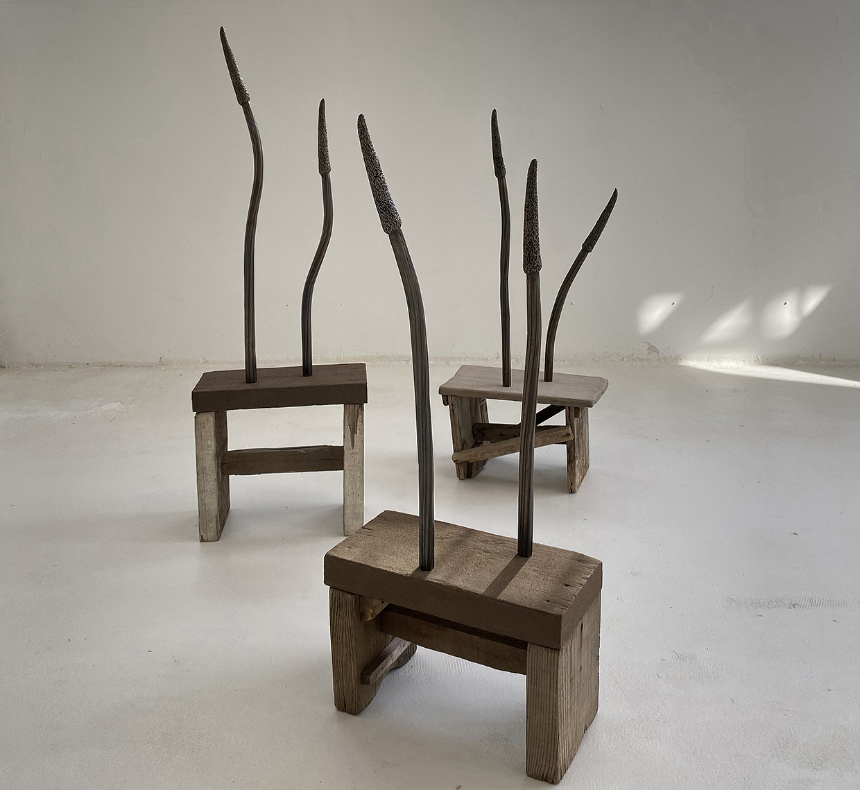 Image: Ancestor stools, 2024, maternal & paternal grandparent wooden stools, maternal grandparents garden soil, parental garden soil, Henley Beach sand, bronze, 1130x1500x1500
